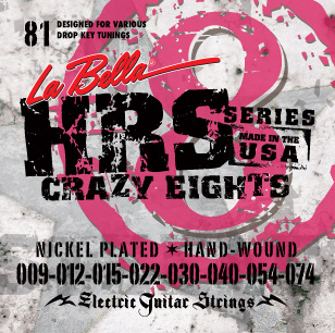 HRS Crazy Eights — это отлично сбалансированный комплект струн, подходящий как для стандартного, так и для пониженного строя. Увеличенный диаметр основы корректирует натяжение пониженного строя, сохраняя ощущения и обертоны гитарных соло верхнего регистра.