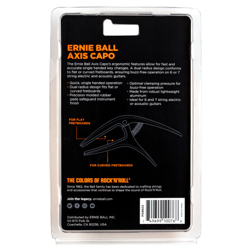 Каподастр Ernie Ball 9603 серии Axis имеет эргономичный дизайн и позволяет быстро и точно менять тональность инструмента касанием одной руки.